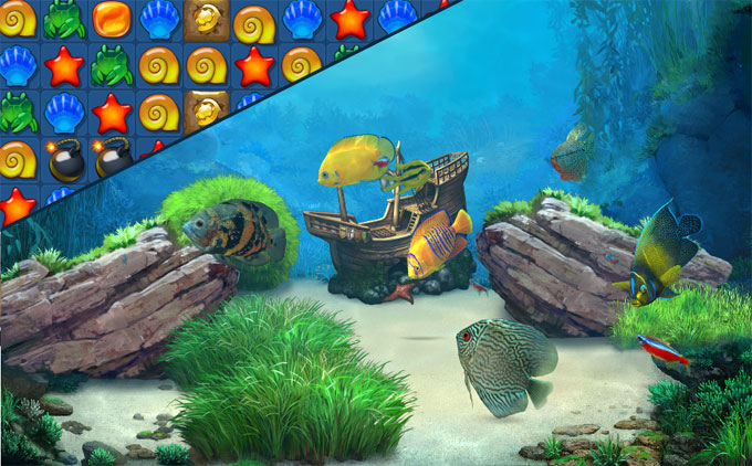 Virtual aquarium with popular match 3 puzzle gameplay